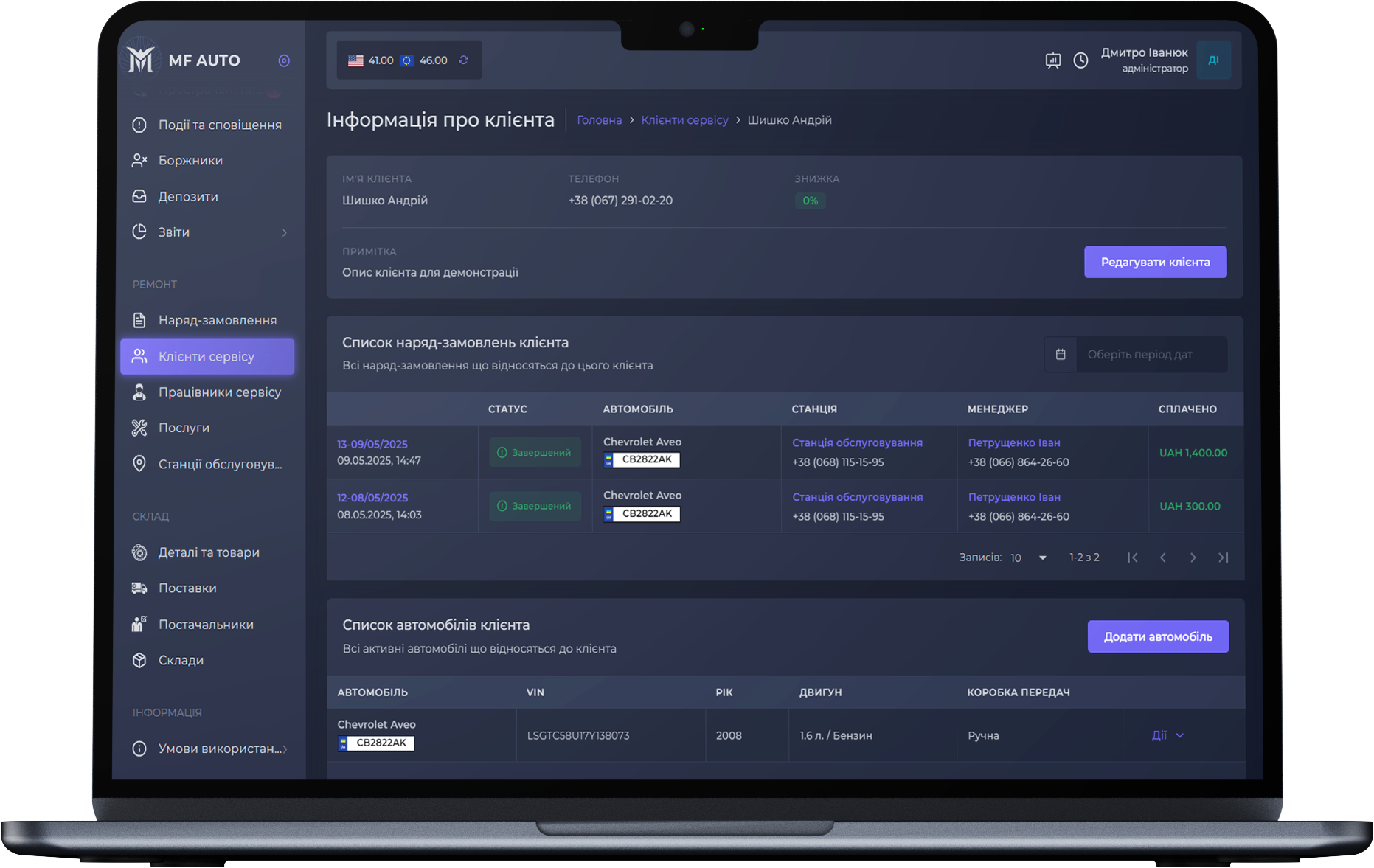 Вы имеете возможность добавлять клиентов, предоставлять им скидки, добавлять их автомобили и просматривать историю обслуживания.