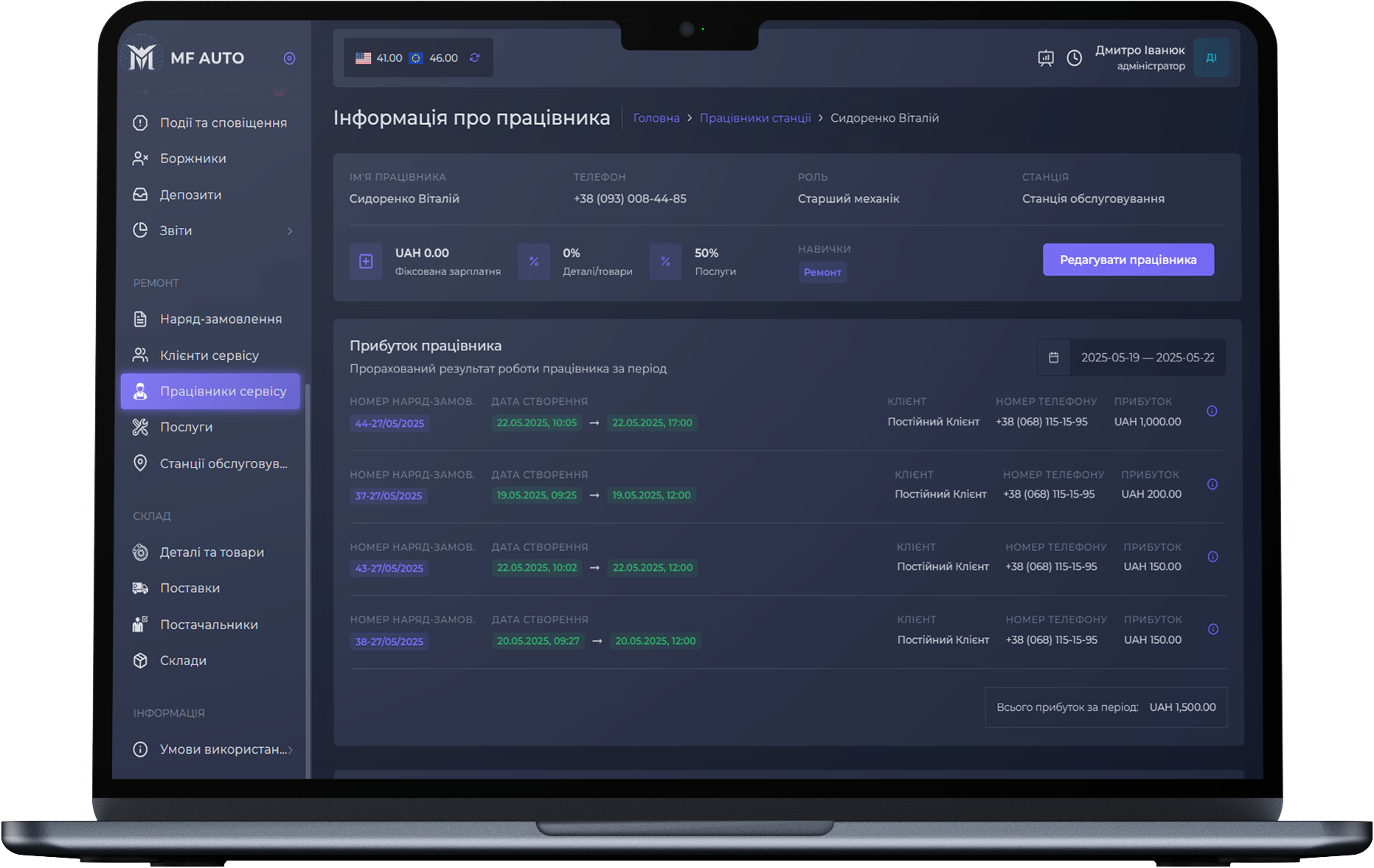 В соответствии с указанными настройками для менеджера/механиков вы можете просматривать прибыль конкретного сотрудника за выбранный период.