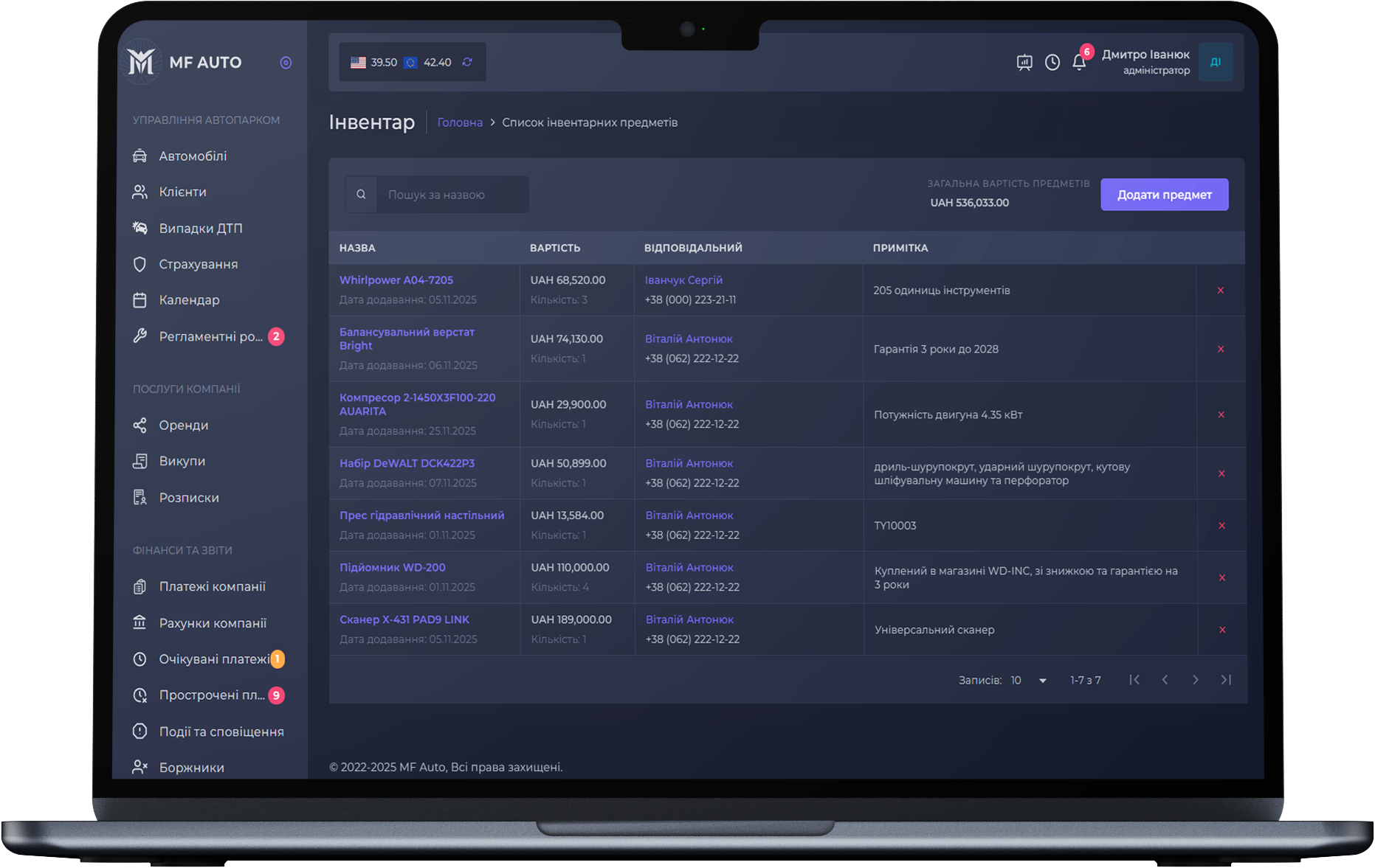 Вы имеете возможность добавлять инвентарь, указывать его количество, ответственных лиц и другую информацию.